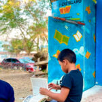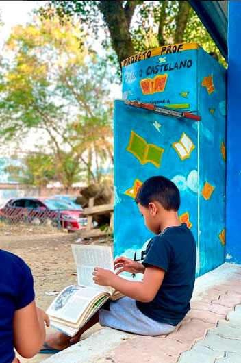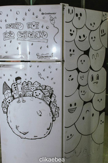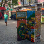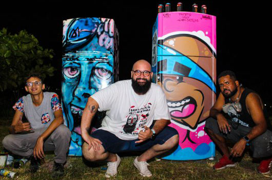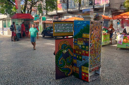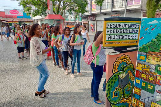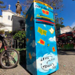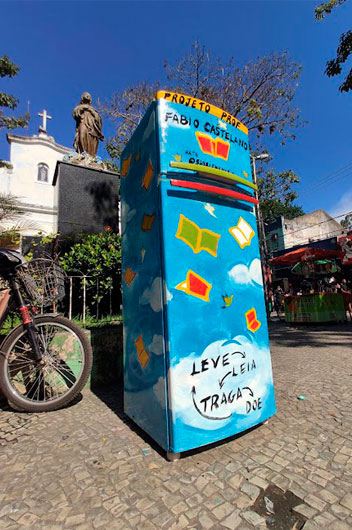 Com o intuito de atingir mais pessoas com o incentivo à leitura, evitando que o compartilhamento ficasse restrito aos dias e locais específicos de nosso Escambo Literário, decidimos convidar o artista local Luis Arthur para pintar uma geladeira e colocar na praça Nossa Senhora da Conceição. A ordem da Geladeira Literária era clara: Pegue um livro – Deixe um livro: Alimente-se. Por se tratar de um material que se deteriora com o tempo e por ficar exposta às mudanças climáticas, a primeira Geladeira acabou se desgastando e ficou sem o suporte da porta, impossibilitando a permanência dela no local. Foi quando conseguimos substituí-la por uma geladeira nova, deixando no mesmo local, desta vez, contudo, a artista local ShyMarias realizou a pintura. Hoje, além da Geladeira na Praça, contamos com uma no bairro Porteira (Queimados), pintada pelo artista Alan Tavares; outra na Estação de Trem de Japeri (Supervia), pintada pelo artista FML; outra na Vila Olímpica de Queimados, pintada pelo artista Ian Marlon; uma no Horto Municipal de Queimados, pintada pela ShyMarias; e trocamos a da Praça Nossa Senhora da Conceição por uma pintada pelo artista Andrey RDK.
